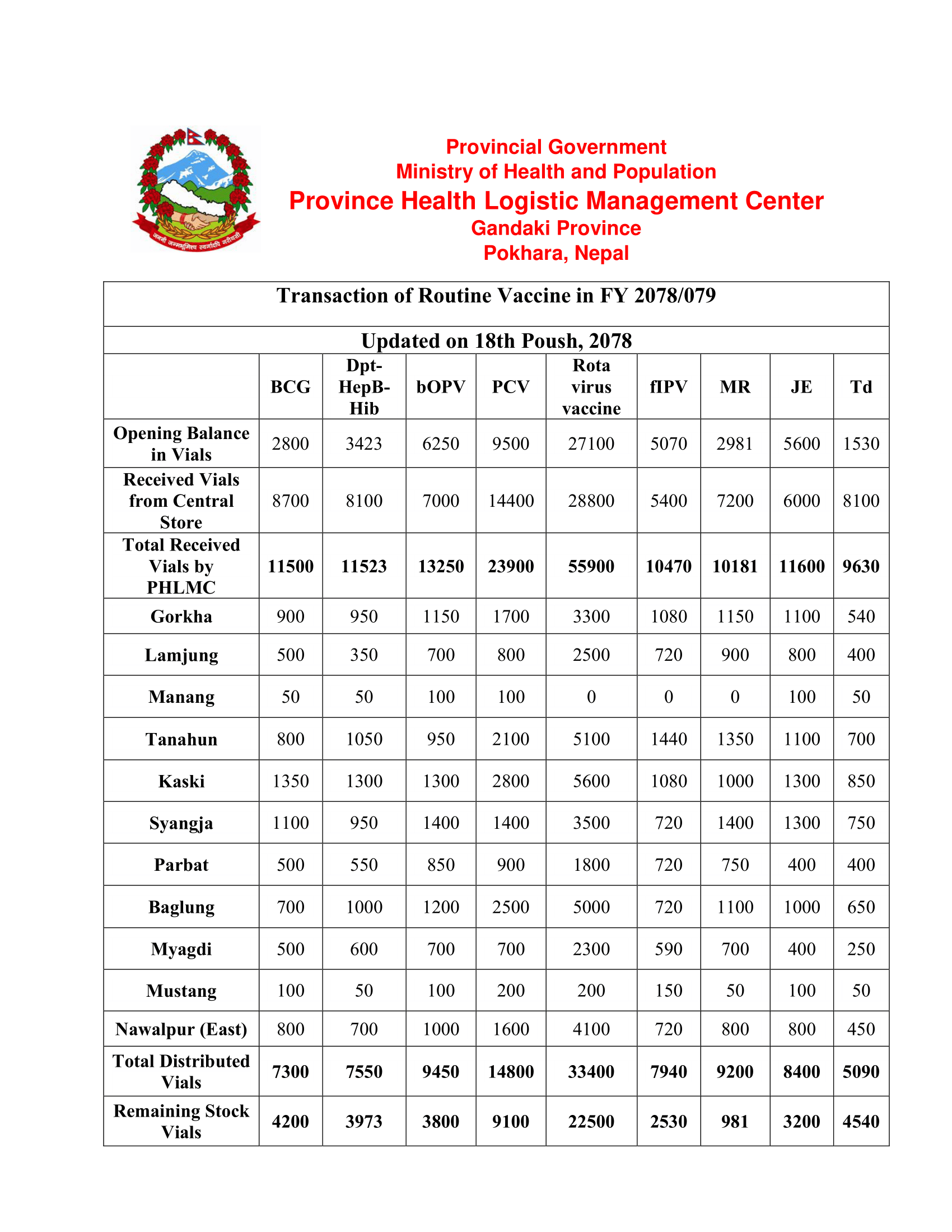 Download: आ.व. २०७८/७९ मा यस केन्द्रबाट जिल्लाहरुमा वितरण गरिएका नियमित खोपको परिमाण