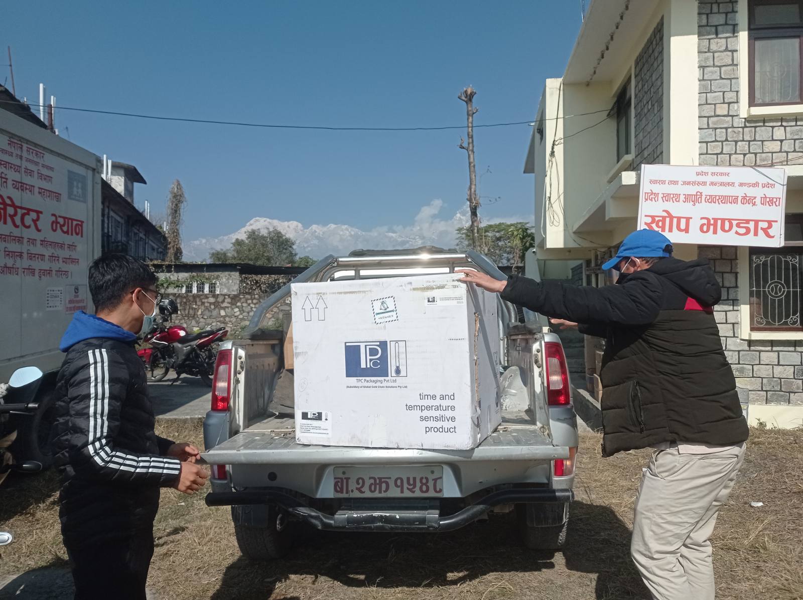 कोभिड-१९ विरुद्धको खोप स्वास्थ्य कार्यालय पर्वतमा पठाउँदै ।
